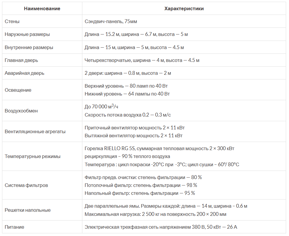 Данная окрасочно-сушильная камера оборудована двумя вентиляторами: приточным и вытяжным. Наличие двух вентиляторов позволяет обеспечивать воздухообмен внутри камеры до 70 000 м³/час, скорость потока воздуха внутри камеры составляет 0.2 — 0.33 м/с. Два приточных вентилятора обладают мощностью по 11 кВт каждый, мощность вытяжных вентиляторов составляет 2 × 11 кВт. Заслонка, переключающая режимы окраска/сушка, срабатывает автоматически посредством пневматики.