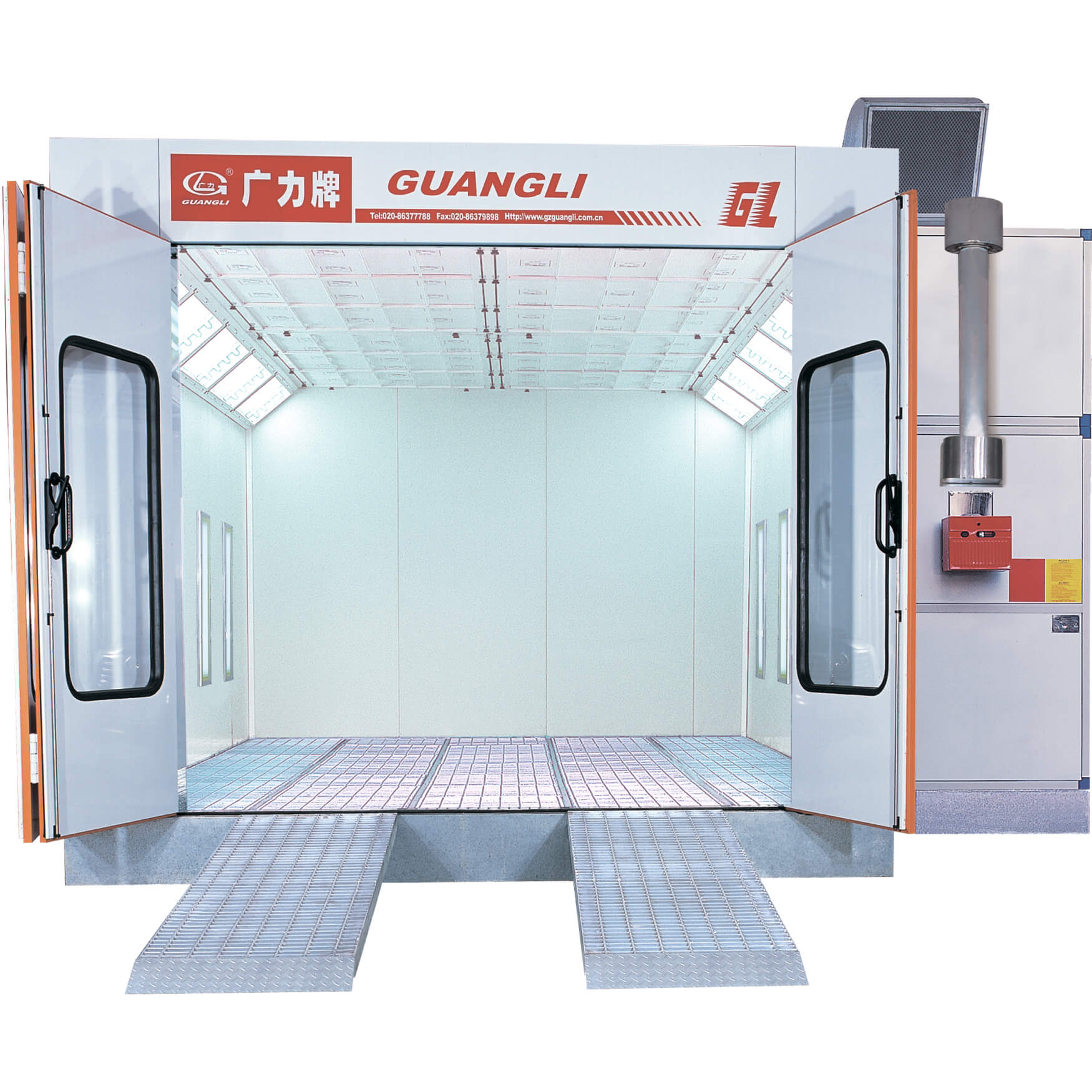Окрасочно-сушильная камера Guangli GL3 LUX имеет в своей основе металлическое основание. Напольные решётки выдерживает нагрузку до 600 кг на одно колесо. В стандартном исполнении камера Guangli GL3 LUX комплектуется дизельной горелкой из нержавеющей стали Riello G20 итальянского производства. Мощность горелки составляет 200 кВт, 90 % нагретого воздуха подвергается рециркуляции. Корпус Guangli GL3 LUX собирается из сэндвич-панелей толщиной 50 мм, в качестве наполнителя используется пенополистирол. Опционально можно в качестве наполнителя можно использовать минеральную вату. Фронтальная дверь камеры состоит из 3-х створок, аварийная дверь находится сбоку камеры, она оборудована пневматическим затвором.