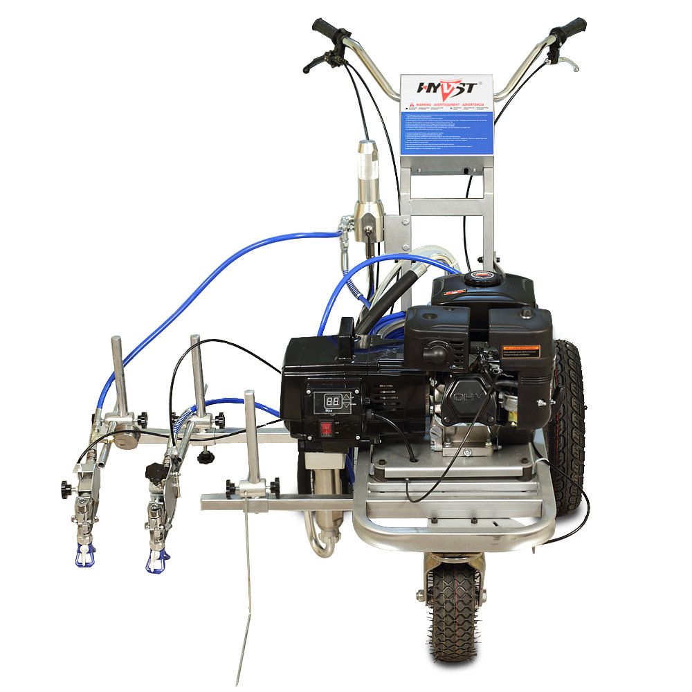 HYVST SPLM 2000 - разметочная машина для безвоздушного нанесения дорожной разметки краской на асфальт. Разметочная машина собрана на базе поршневого насоса для краски и бензинового двигателя. Машину для нанесения дорожной краски можно толкать, также ее можно использовать как подающий поршневой насос с бензиновым двигателем и держать машину в кузове грузовика, и наносить краску окрасочным пистолетом вручную по шаблону. Машина может наносить как прямые линии, так прерывистые. Также, благодаря переднему поворотному колесу, можно наносить радиусы, фиксируя переднее колесо под нужным углом. Машина может наносить двойные сплошные и прерывистые линии, пешеходные переходы.