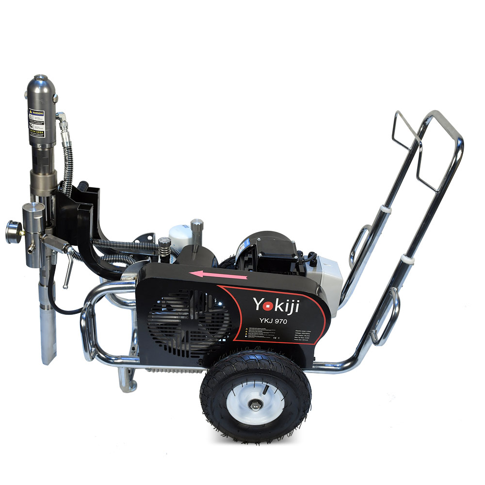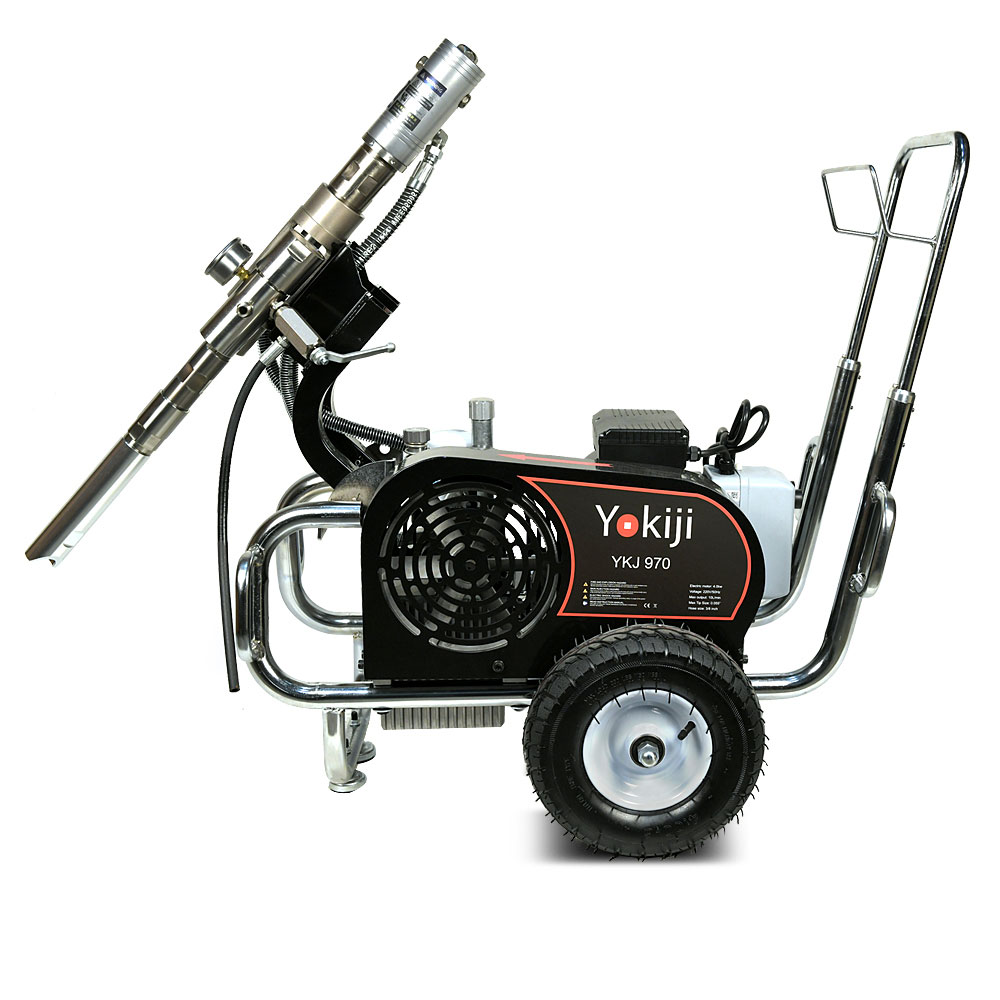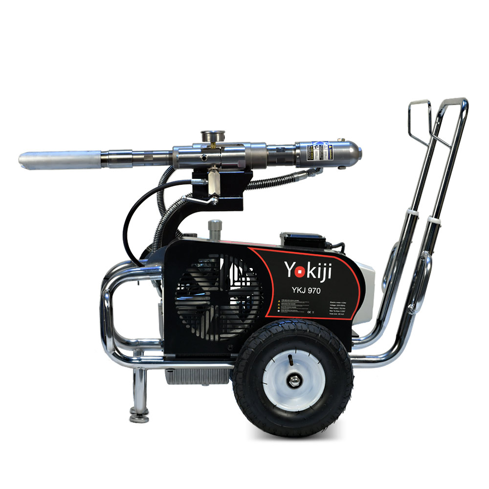 YOKIJI YKJ 970 – гидропоршневой безвоздушный электрический окрасочный аппарат. Он может применяться для распыления материалов с высокой, средней и низкой вязкости: красок, эмалей, шпаклевок, огнезащитных, гидроизоляционных, антикоррозийных и цинконаполненных составов, мастик, грунтовок. Аппарат используется на стройплощадка при отделке помещений, зданий и сооружений, а также на производствах при покраске больших конструкций. Модель работает от розетки 220B и обладает высокой производительностью (10 л/мин); позволяет присоединять до 3 малярных постов и подавать материал на высоту до 90 метров.