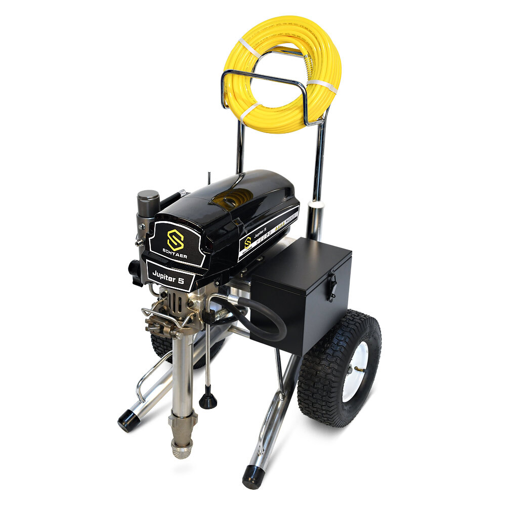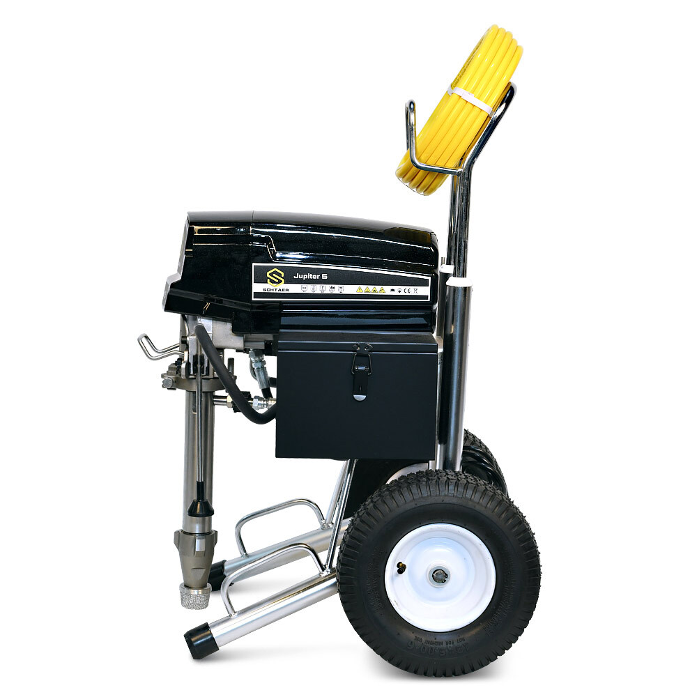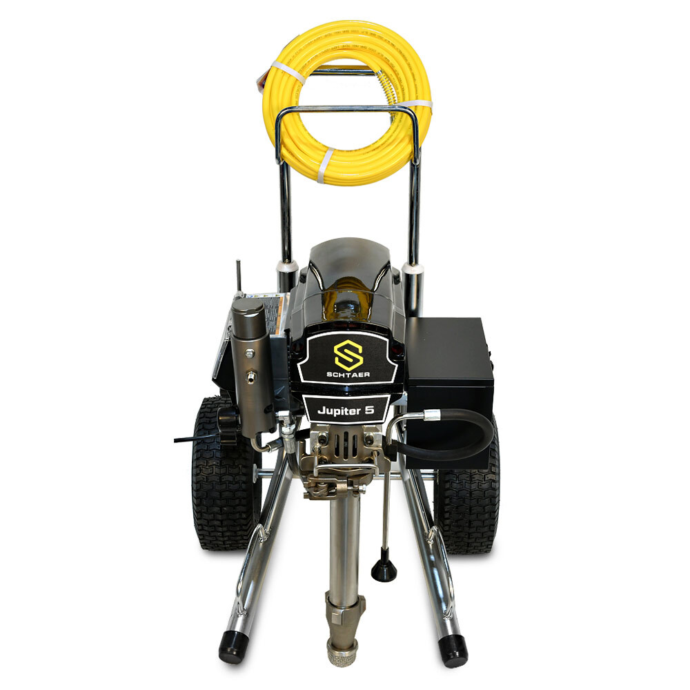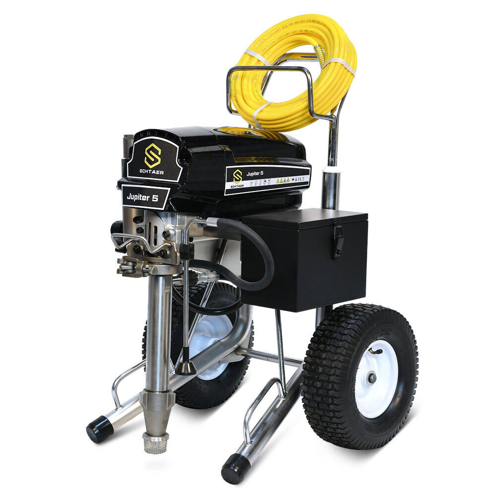 Schtaer Jupiter 5 – представляет собой универсальную окрасочную машину для распыления вязких лакокрасочных материалов безвоздушным методом. Обладает высокой производительностью, распыляет краску со скоростью 5,1 л/мин, способна работать на значительном удалении от установки (при подключении шланга максимальной длины). Аппарат обладает мощностью 2,6 кВт, работающий под давлением 227 Бар обеспечивает равномерное распределение лакокрасочных материалов разной степени вязкости по окрашиваемой поверхности. Модель считается универсальной так как работает с различными лакокрасочными материалами. Его можно использовать для нанесения теплоизоляции, распыляемой однокомпонентной гидроизоляции, с красками по металлу, грунту, а также с эпоксидными материалами. Для работы прибора требуется розетка с напряжением в 220 В. Совместим с наконечниками разного диаметра (максимальный размер 631).