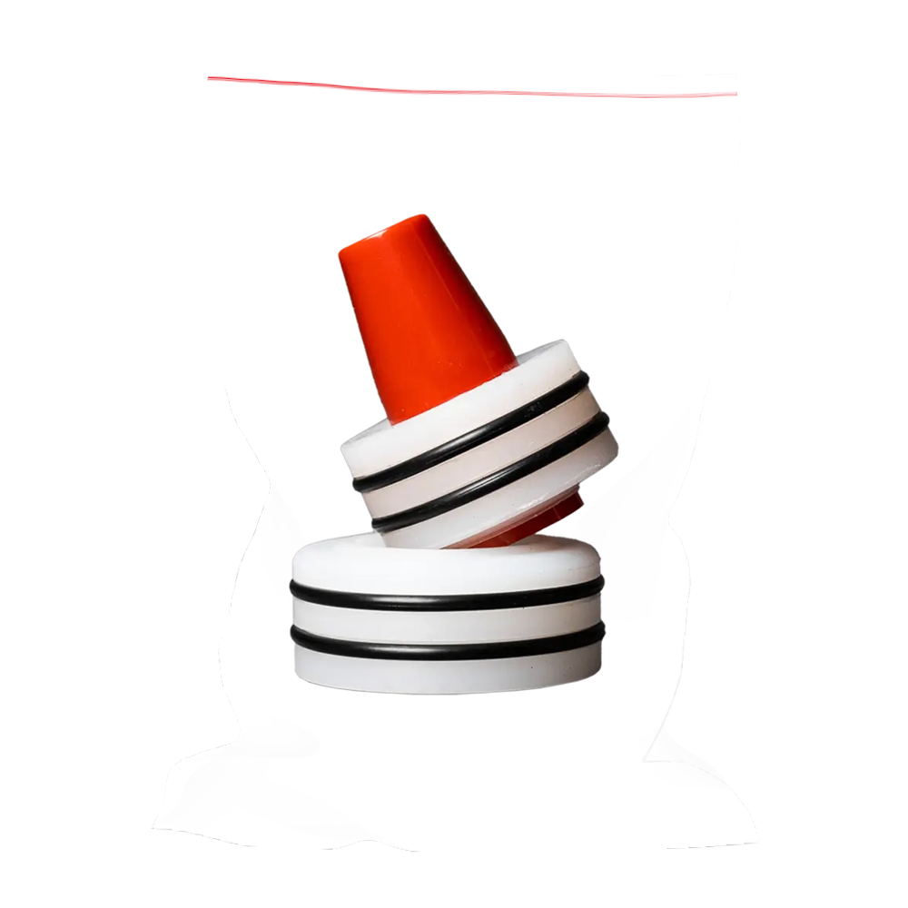 Комплект уплотнений состоит из двух разных колец (по диаметру и толщине), изготовленных из сверхвысокомолекулярного полиэтилена. Они предназначены для герметизации рабочего объема насоса и устанавливаются в его корпус. В процессе работы плунжер вызывает износ уплотнений. Признак их износа - появление краски в горловине насосе.